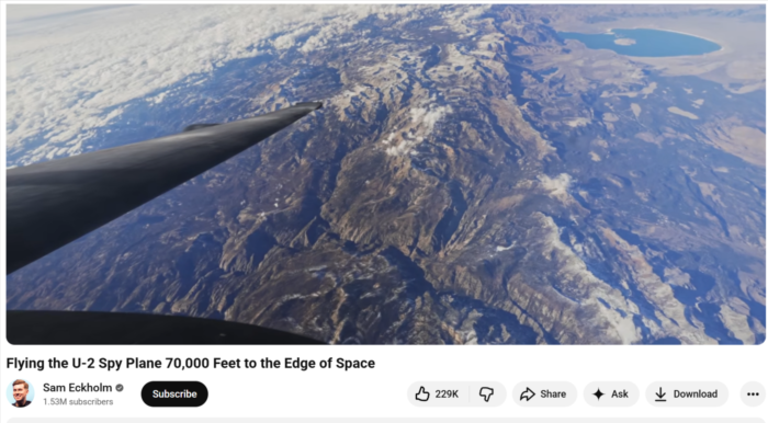 Built in secrecy. Designed to defy limits. Experience the U-2 Dragon Lady and a flight to the edge of space. Enjoyed this video? Make sure to check out our full 360º extended cut of my U-2 flight here!    • 360° U-2 Spy Plane Flight | Full Cockpit R…   Get your Insta360 X4 + Free Extended Selfie Stick: https://www.insta360.com/sal/x4?utm_t… Follow Me Here: ——————————————— ? Instagram –   / sameckholm   ?? X –   / sameckholm   ? TikTok –   / sameckholm   ? Facebook –   / sameckholm   ? Join My Discord! –   / discord   ?? Sign up for My Newsletter! – https://bit.ly/3VJEpfV ? Interested in the Air Force Academy and becoming a pilot? Check out my Academy Blueprint Program here! https://www.academyblueprint.com/ THE DREAM TEAM Head of Production/Lead Editor:   / chance.saechao   Cinematographer #2:   / paul.ossowaski   Cinematographer #3:   / sactownavphoto   Post-Production Editor:   / matttornquist   Producer:   / swayne.martin   VIDEO CHAPTERS: 0:00 U-2 Introduction 1:17 Chase Car 3:05 U-2 Spy Plane Origins 3:42 Cold War Controversy 5:08 Gary Powers Incident 6:25 Bridge of Spies 7:20 U-2 Walkaround 9:12 Cockpit Tour 9:50 Why the U-2 Still Flies 10:50 Pre-Flight Training 12:02 Insta360 Cameras 13:35 U-2 Space Suit 14:18 Suit Fitting 15:12 Claustrophobia Check 16:45 Space Suit Training 18:16 Gear Up & Launch 21:42 Climb to 70,000 Feet 22:25 Space Equivalent Zone 23:45 The Edge of Space at 70,000 Feet 25:15 Coffin Corner 27:38 Eating My Apple Pie 28:51 Journey Down to Earth *Non-Endorsement Statement – Reference to any specific company, products, processes, or services by trade name, trademark, manufacturer, or otherwise in this video does not constitute or imply its endorsement by the United States Air Force, Department of Defense, or any other governmental entity. ——————————————– Email: ?? contact@sameckholm.com